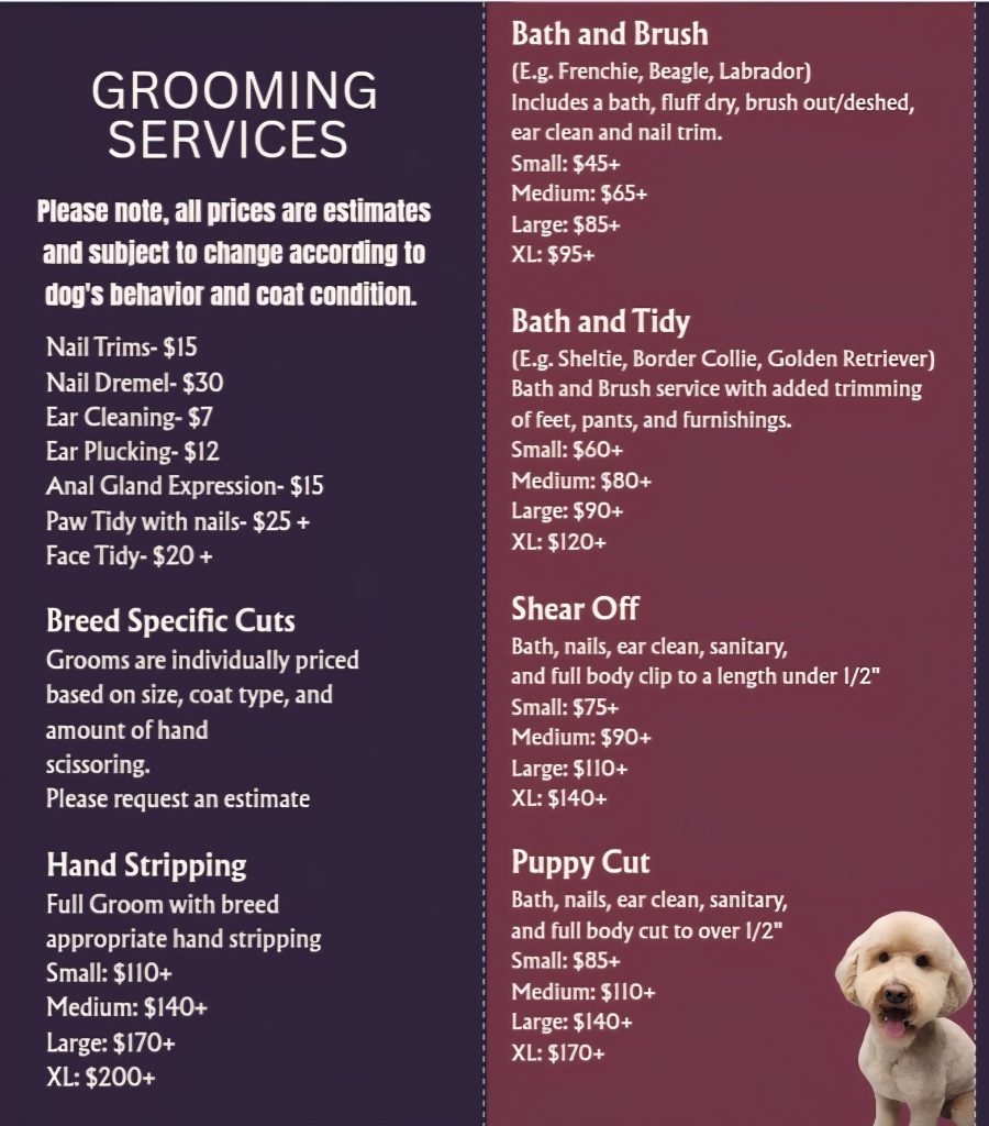 All breed dog grooming with a focus on one on one, fear free grooming for senior and nervous dogs. 18 years grooming experience with Fear Free Certification and up to date Pet First Aid training.